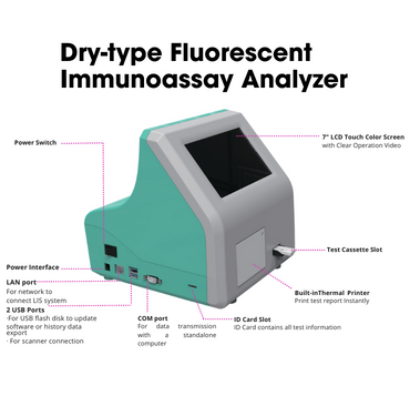 Experience comprehensive diagnostics with the Apoti Plus - Dry-type Fluorescent Immunoassay Analyzer. Our versatile test menu includes Inflammation (CRP, PCT, IL-6, SAA), Tumor Markers (PSA, AFP, CEA, FOB), Cardiac Markers (cTnI, cTnT, NT-proBNP, CK-MB, H-FABP, Myoglobin, Troponin I/Myoglobin/CK-MB - 3 in 1), Troponin I/NT-proBNP/D-Dimer - 3 in 1, Coagulation (D-Dimer), Endocrinology (FSH, LH, T3, T4, Testosterone, Beta-hCG, Progesterone, Ferritin, TSH, AMH, Prolactin, FT4, FT3), Nephrology (mAIb, CysC, Beta 2MG, N-GAL), Infectious Diseases (Strep A, FLU A+B, RSV, COVID-19 Antigen, COVID-19 IgG/IgM, COVID-19 S-RBD IgG Antibody, COVID-19/FLU A+B - 2 in 1, Dengue IgG/IgM, Dengue NS1, Syphilis, H.pylori Antigen, HBsAb), and Others (IgE, HbA1c - incubator optional, Vitamin D). Accurate and efficient diagnostics for a wide spectrum of medical conditions.